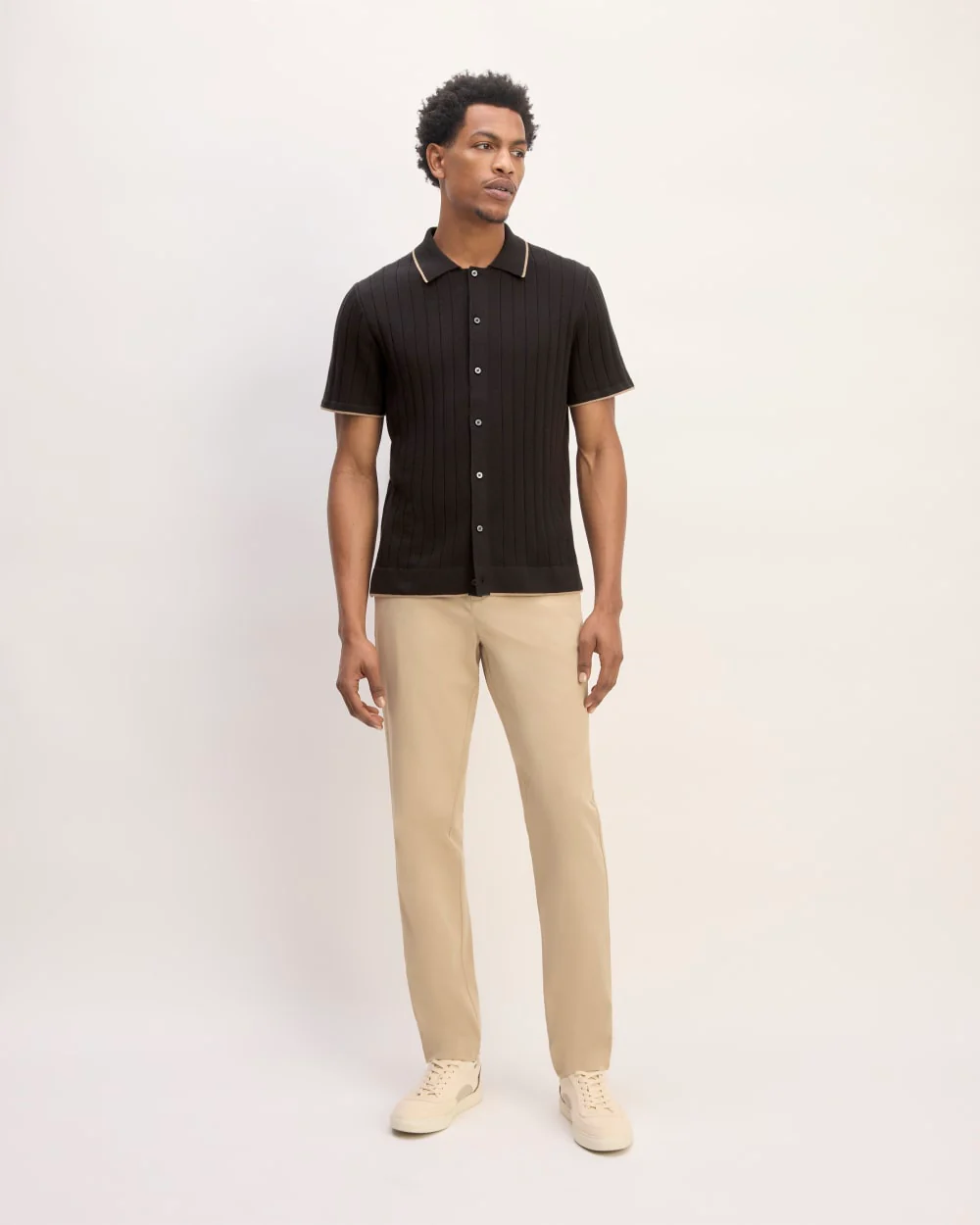 This piece features a slim polo top in a textured sweater knit fabric, short sleeves, button-front placket, and made of a blend of 60% organic cotton, and 40% ecomade coolmax materials.